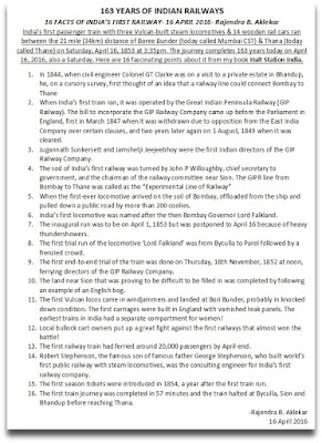 FACTS OF INDIA’S FIRST RAILWAY- 16 APRIL 2016- Rajendra B. Aklekar